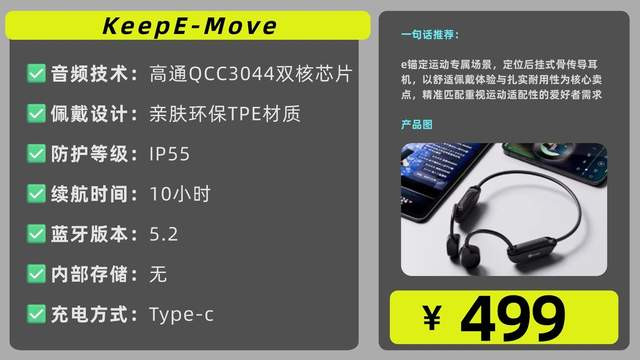 KeepE-Move锚定运动专属场景,定位后挂式骨传导耳机,以舒适佩戴体验与扎实耐用性为核心卖点,精准匹配重视运动适配性的爱好者需求。